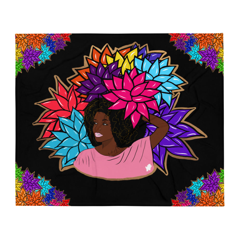 This Beauty with Flowers Throw Blanket features a vibrant and colorful floral design that celebrates black girl magic. Wrap yourself in beauty, warmth, and representation with this cozy and stylish throw blanket. Perfect for snuggling up on the couch or adding a pop of color to any room.