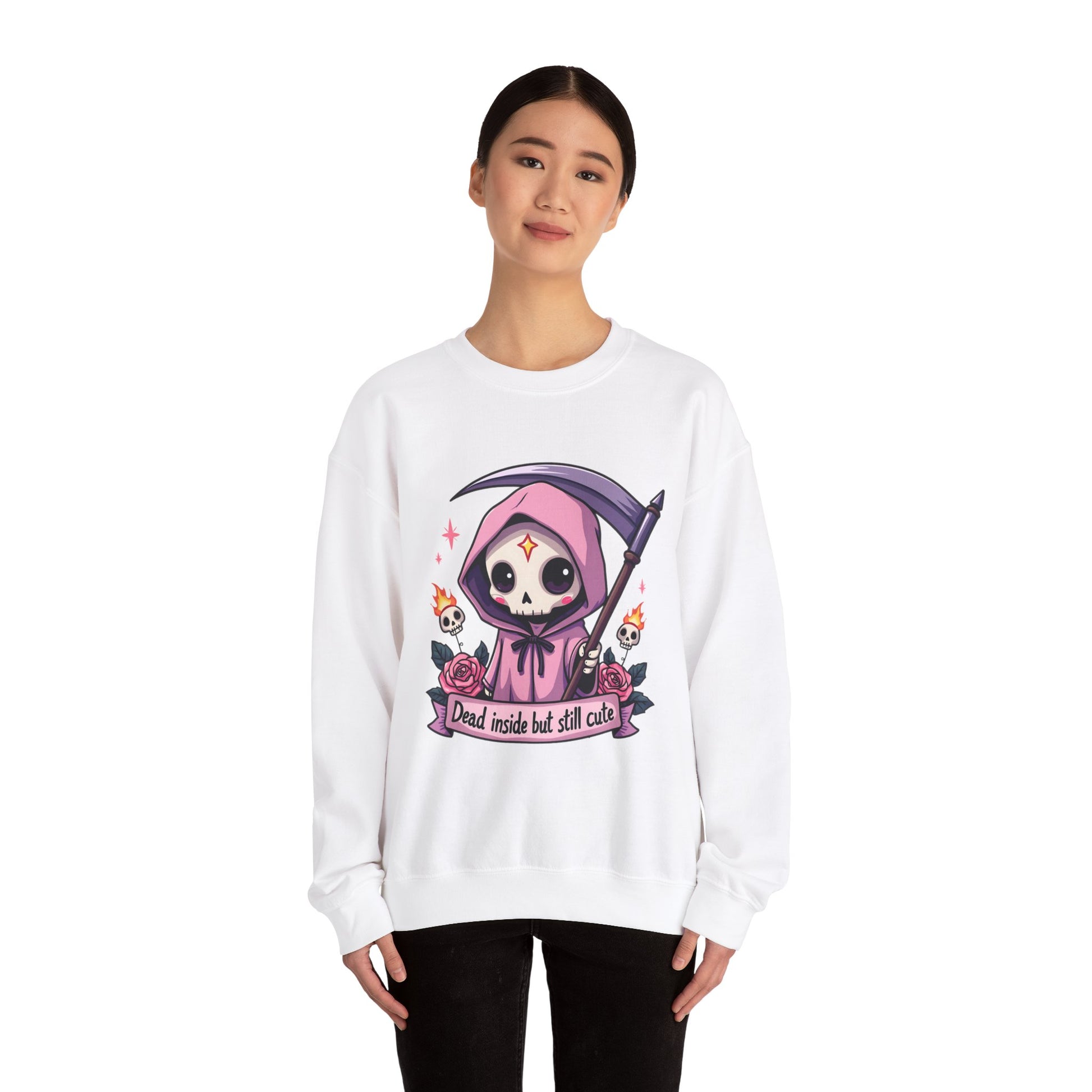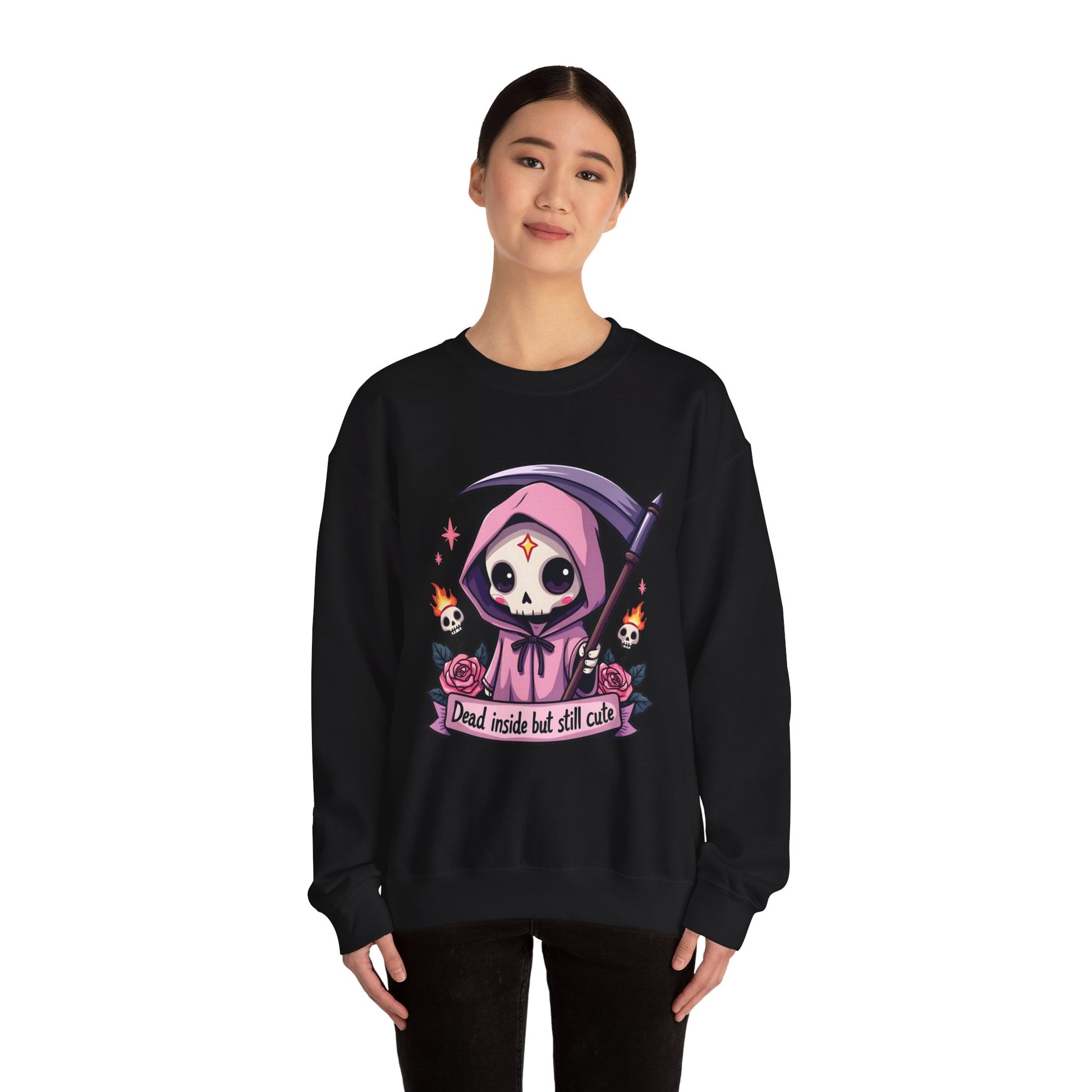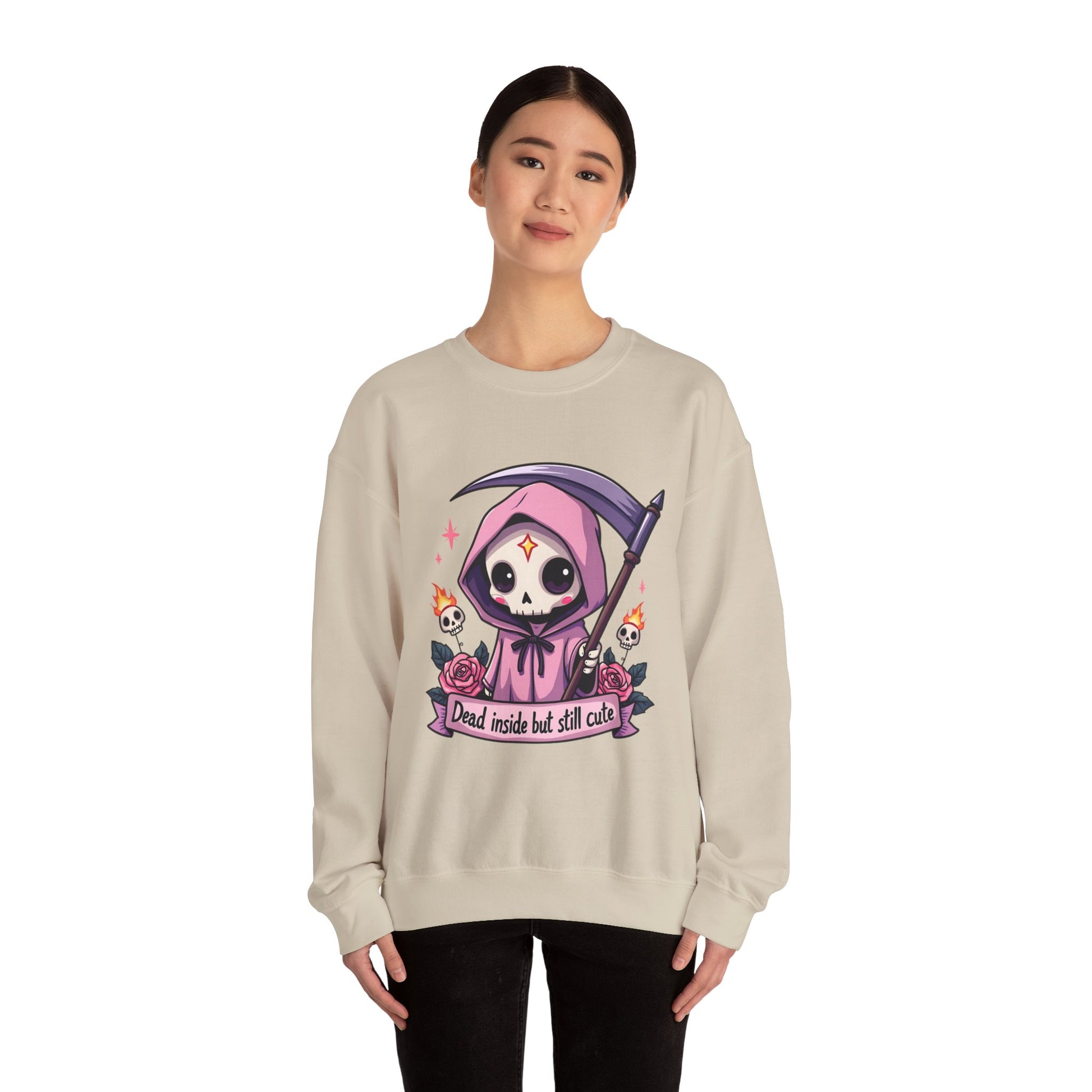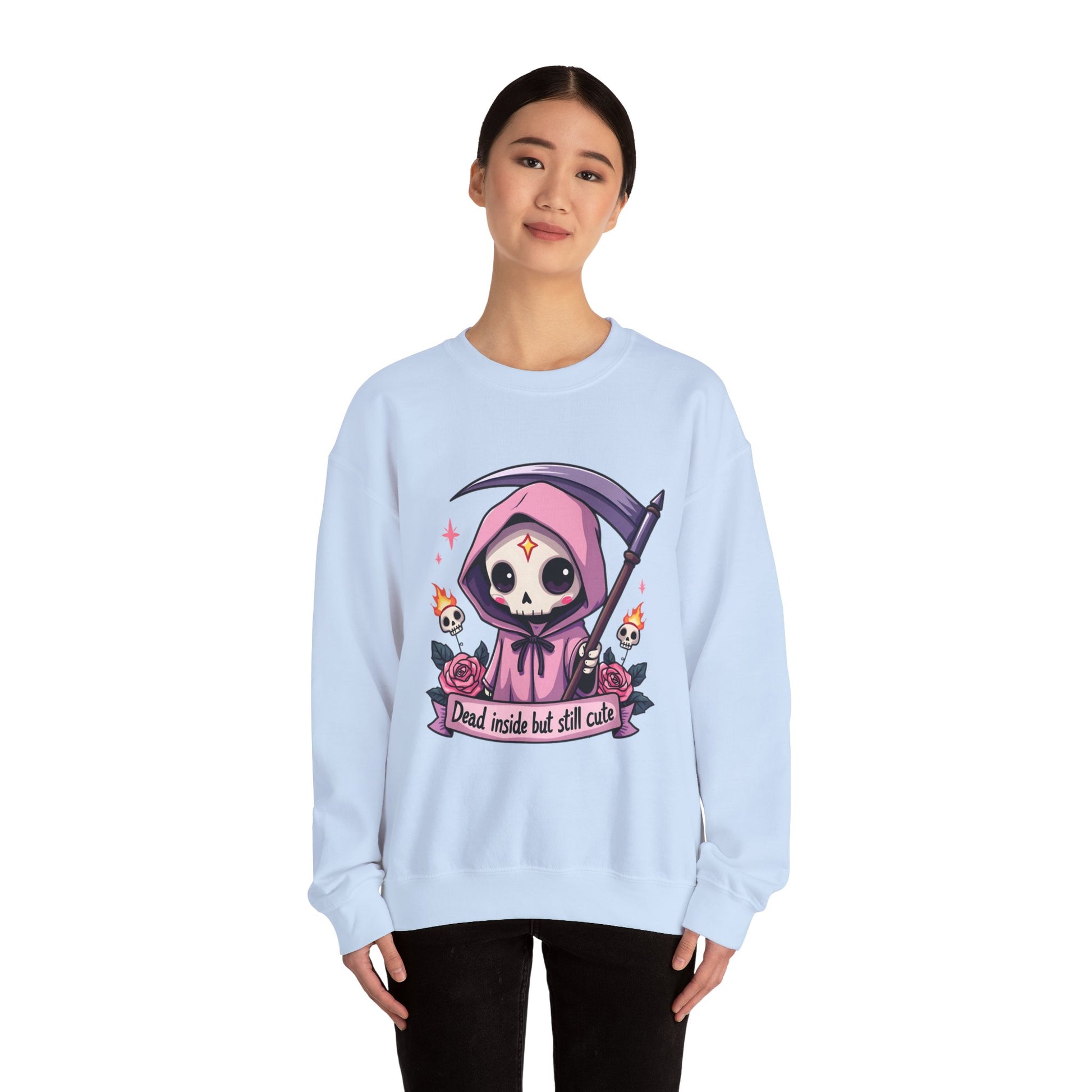 This spooky sweatshirt features a design of Dead Inside But Still Cute, with a little grim. Perfect for those who love Halloween, horror, and all things creepy, spooky, and cute. This cozy sweatshirt is ideal for the colder months, offering a classic fit with a comfy crew neckline. It's great for anyone looking to add a touch of Halloween spirit to their wardrobe.