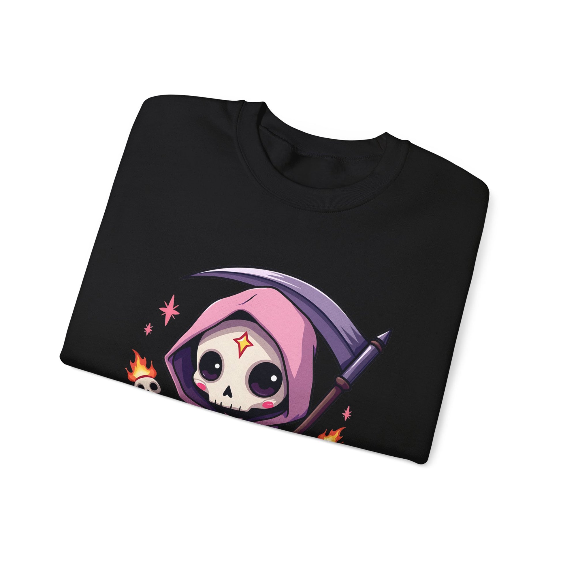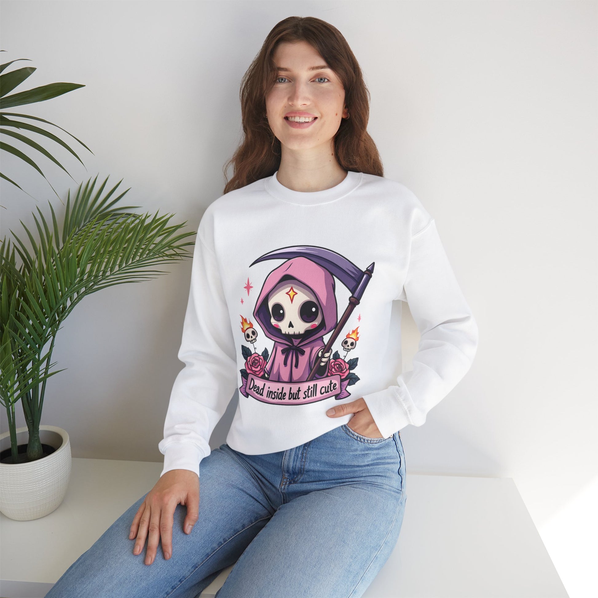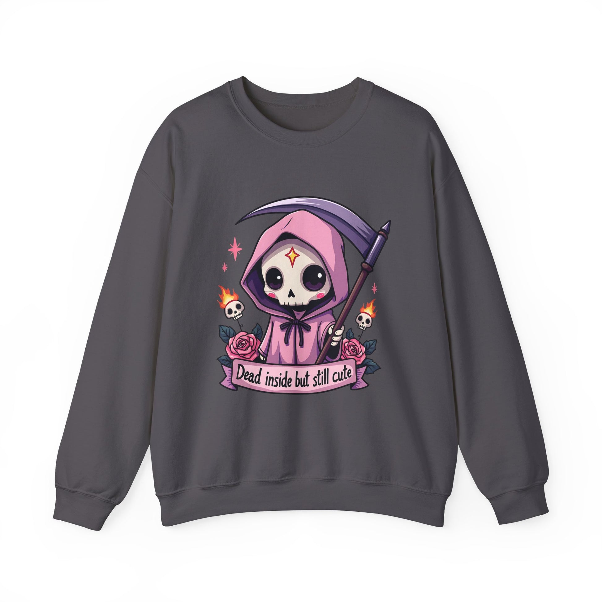 This spooky sweatshirt features a design of Dead Inside But Still Cute, with a little grim. Perfect for those who love Halloween, horror, and all things creepy, spooky, and cute. This cozy sweatshirt is ideal for the colder months, offering a classic fit with a comfy crew neckline. It's great for anyone looking to add a touch of Halloween spirit to their wardrobe.