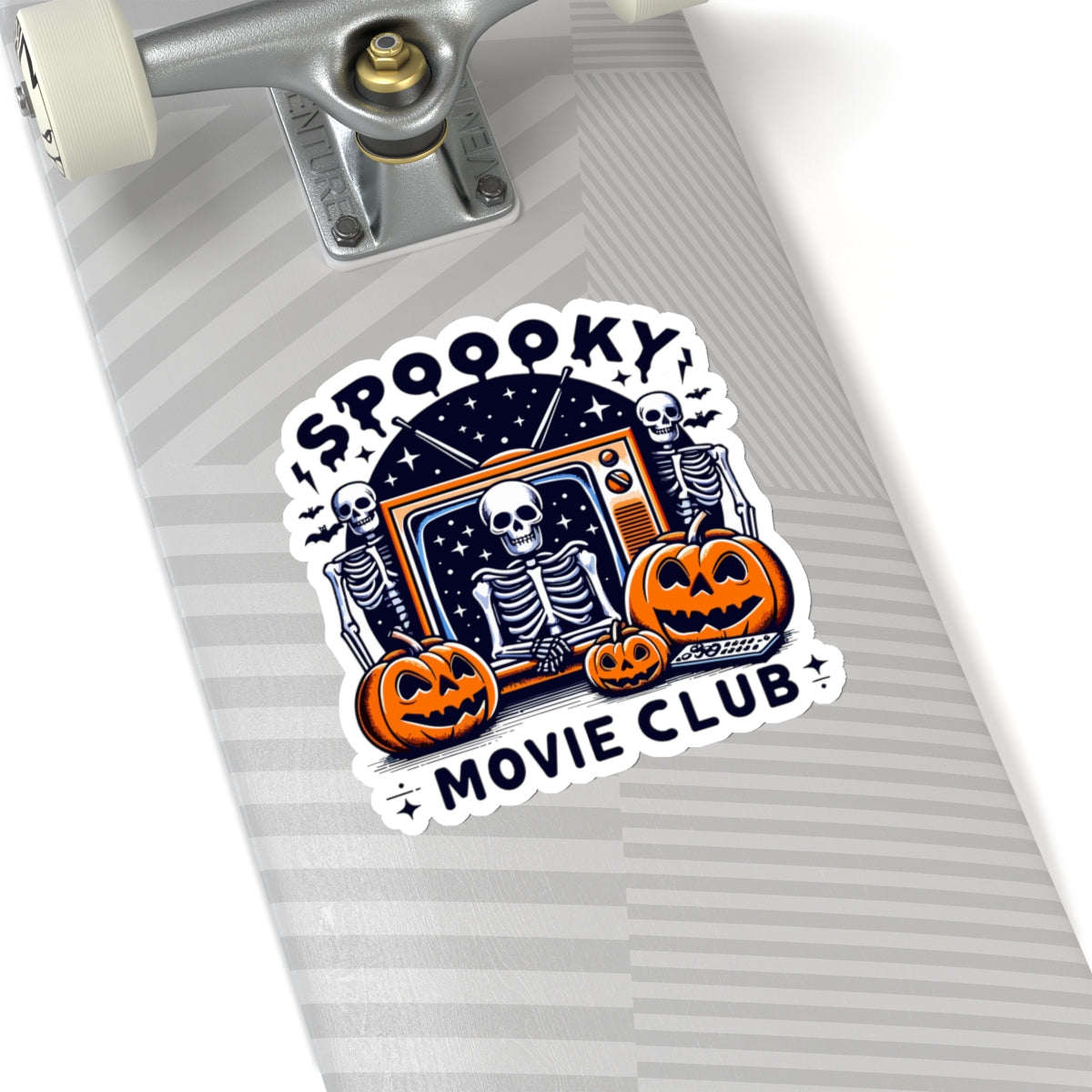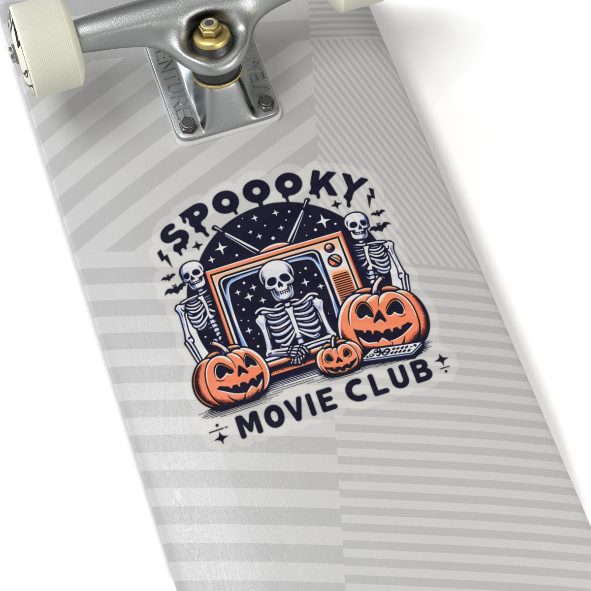 Spooky Movie Club kiss-cut stickers, featuring skeletons, a retro tv, and carved pumpkins. Perfect for Halloween enthusiasts or fans of horror movies. Ideal for decorating laptops, journals, windows, and more.