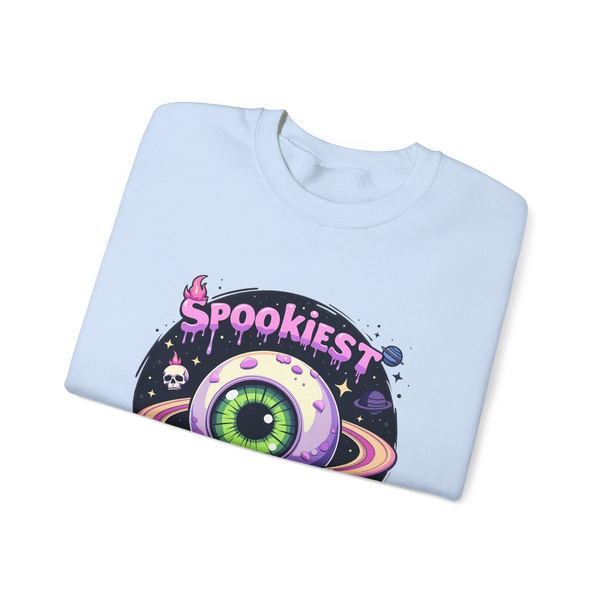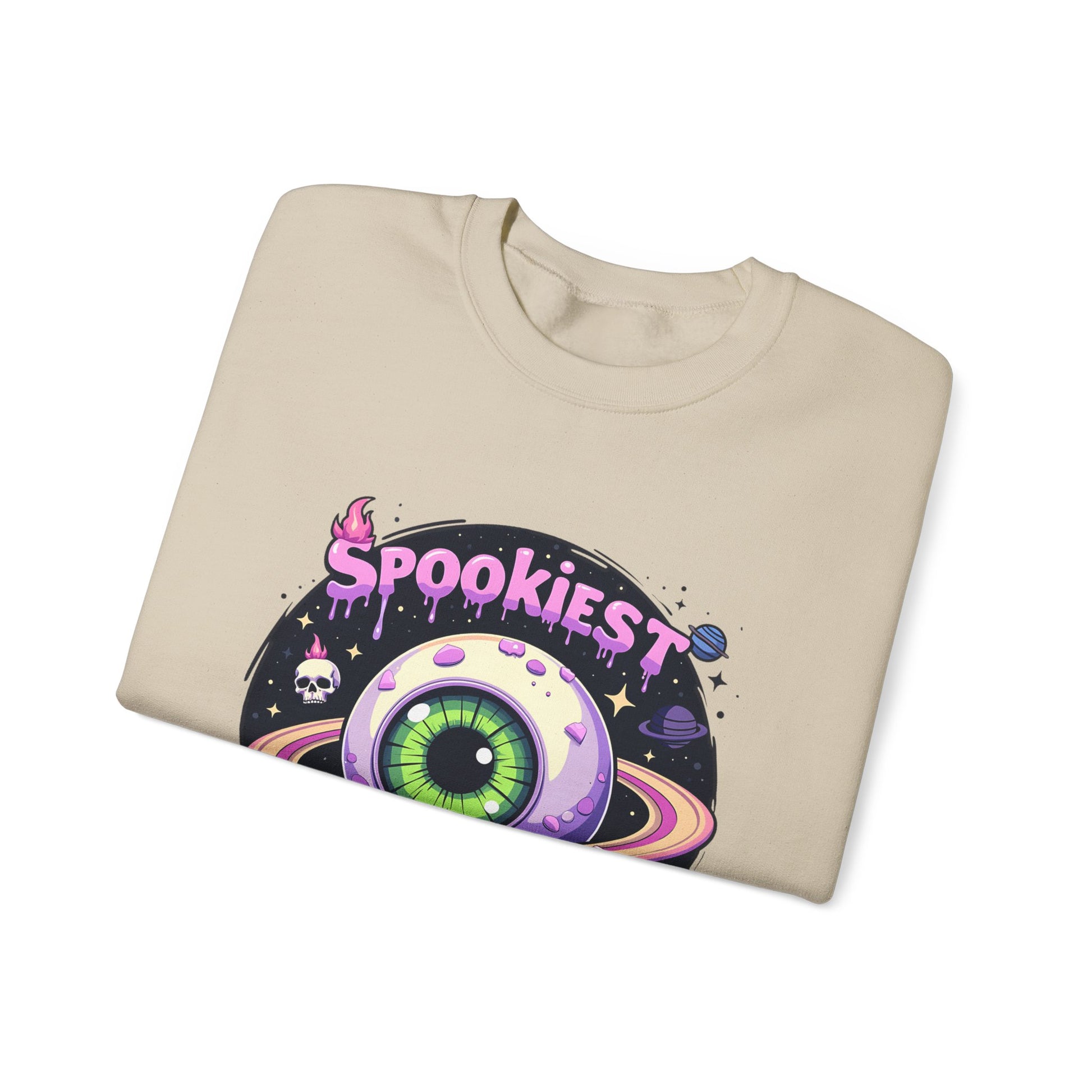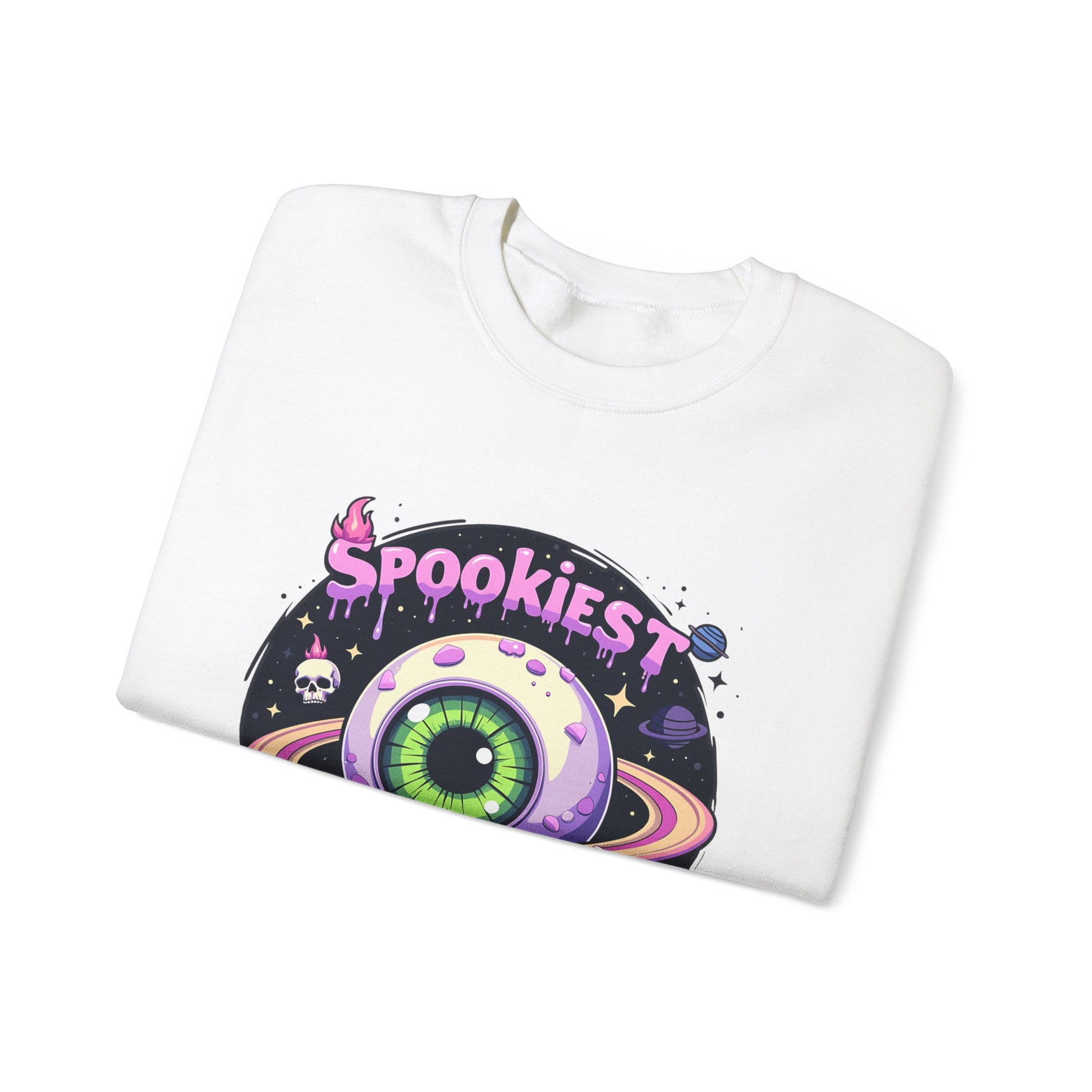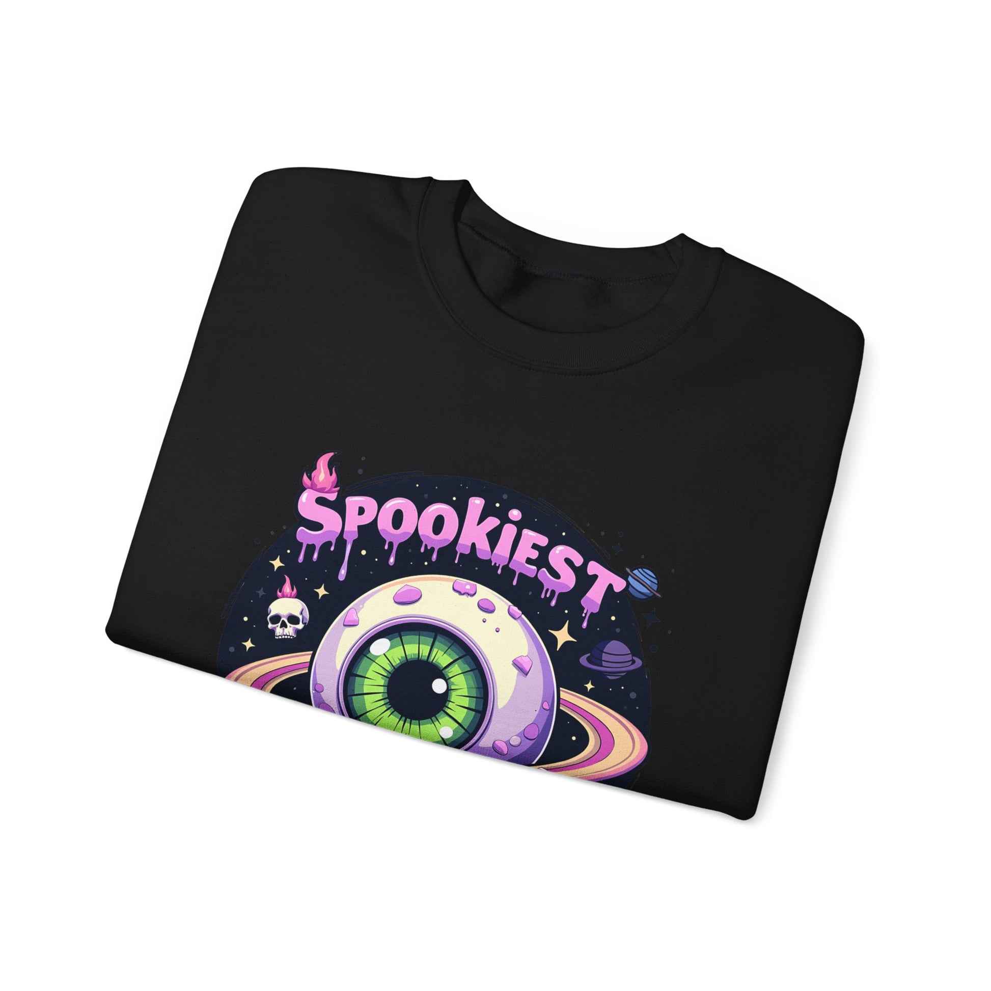 This spooky sweatshirt features a design of the Spookiest in the Galaxy, with an eyeball planet and skulls. Perfect for those who love Halloween, horror, and all things creepy. This cozy sweatshirt is ideal for the colder months, offering a classic fit with a comfy crew neckline. It's great for anyone looking to add a touch of Halloween spirit to their wardrobe.