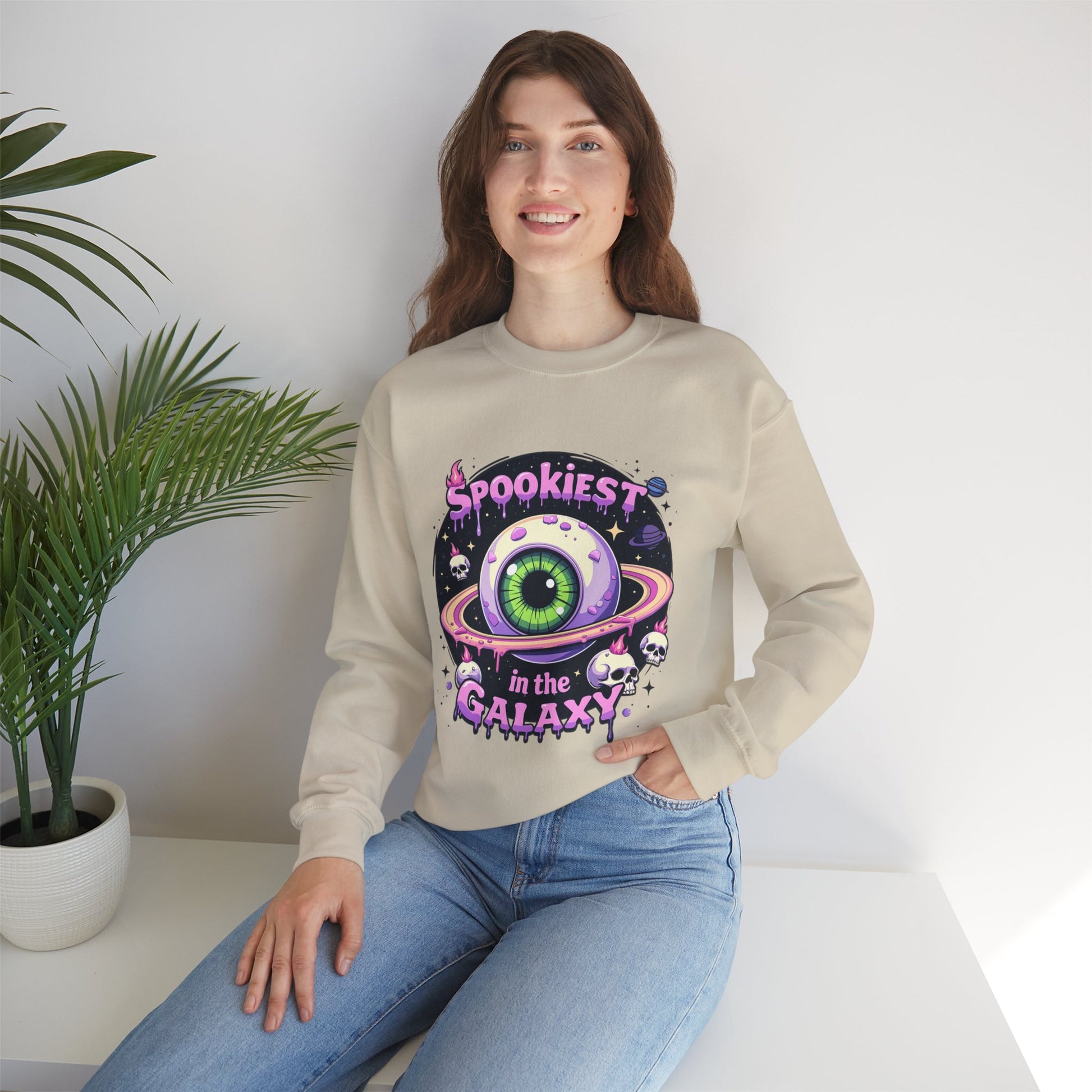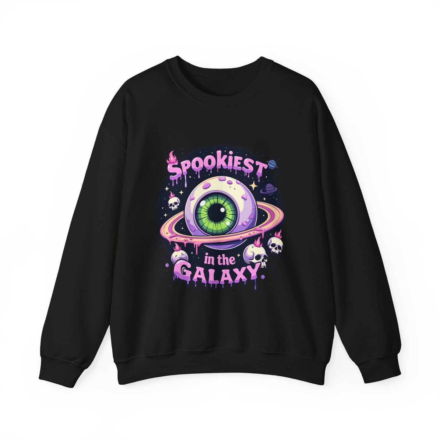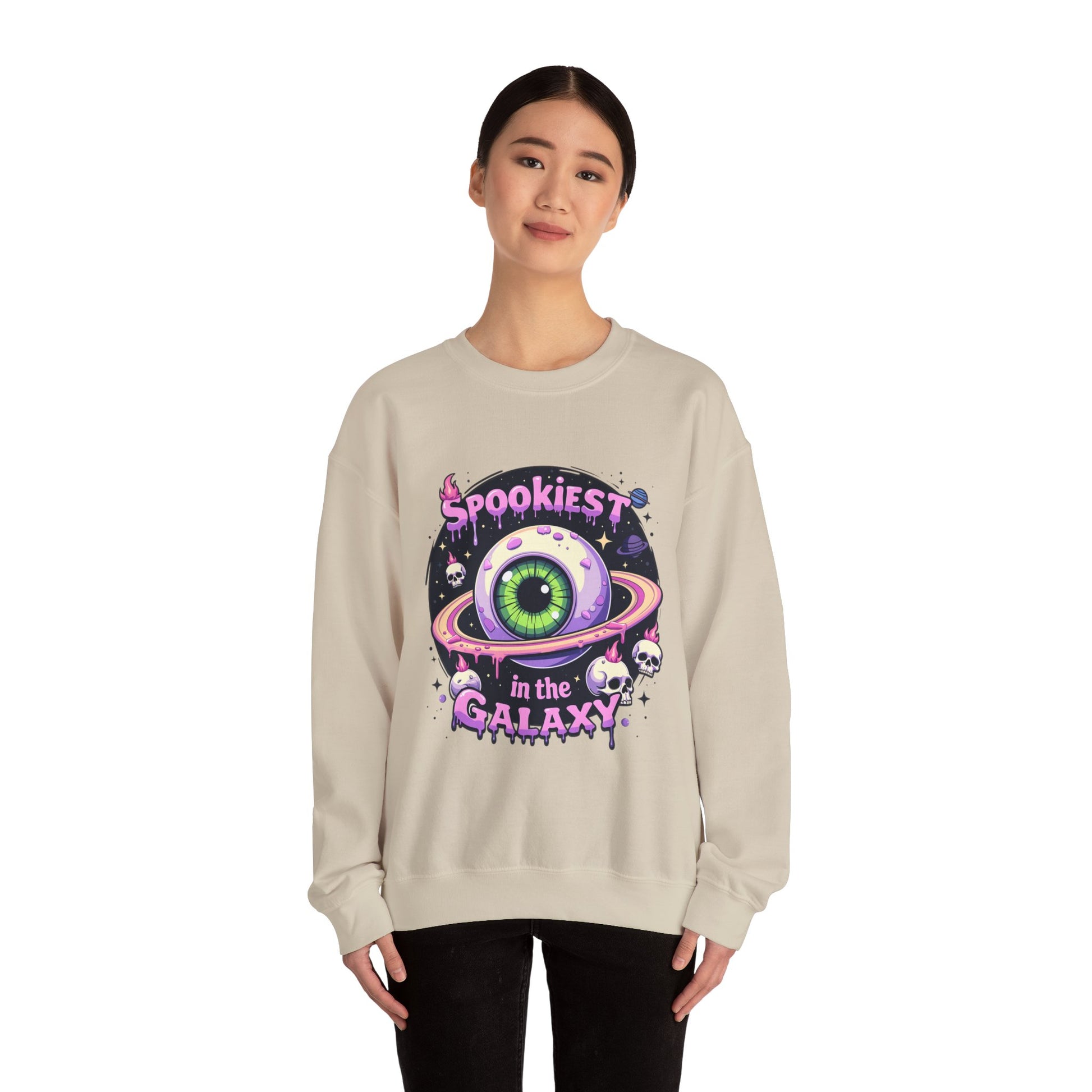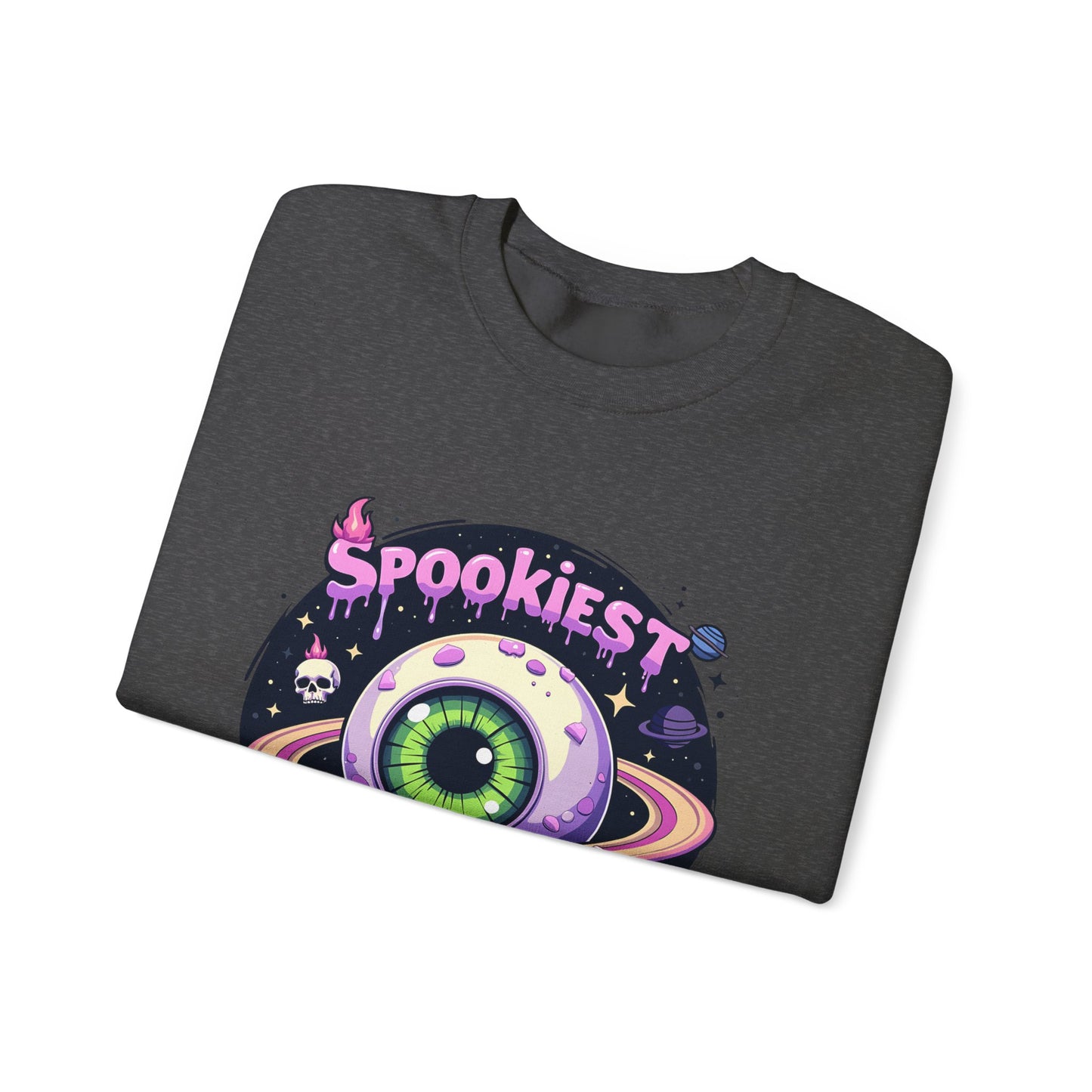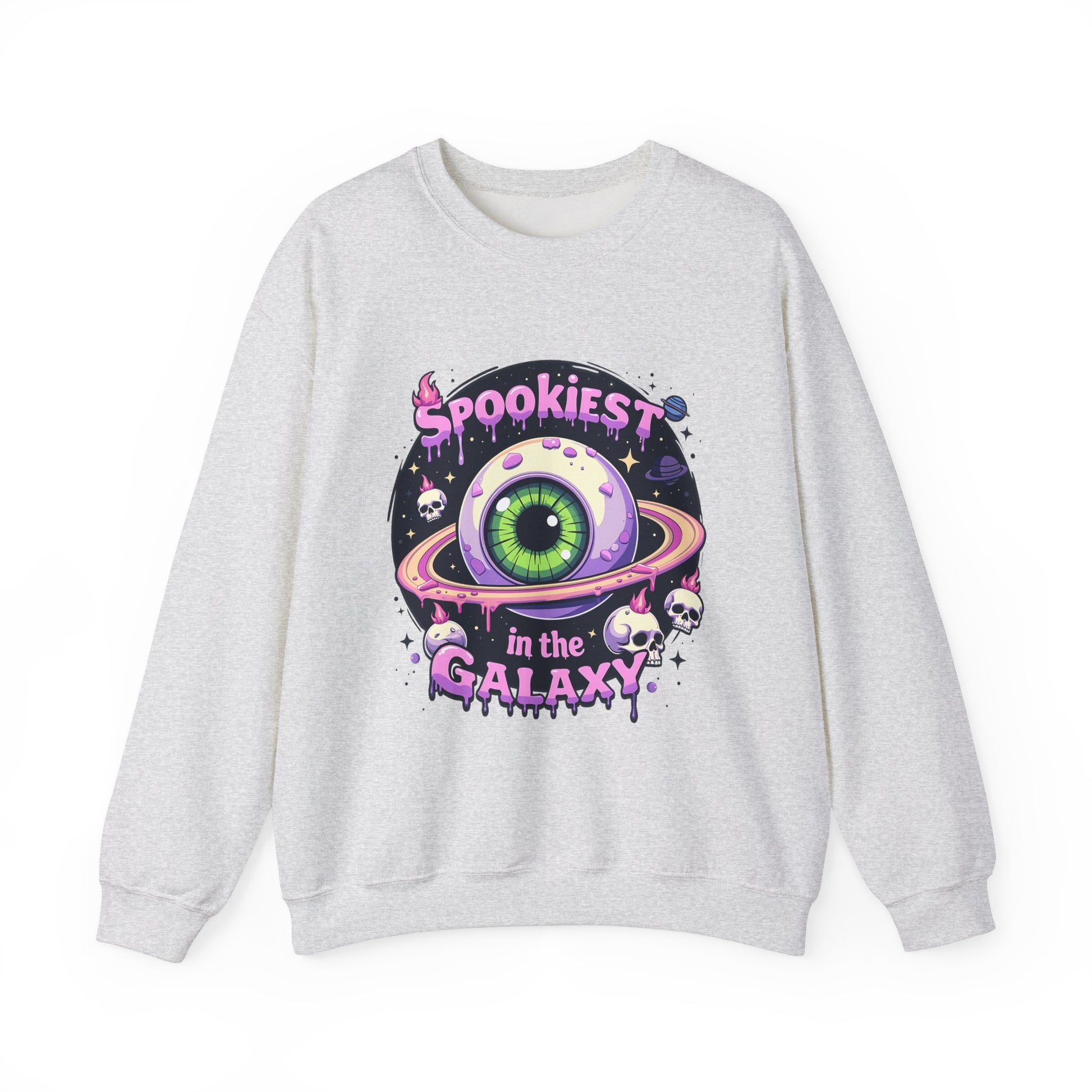 This spooky sweatshirt features a design of the Spookiest in the Galaxy, with an eyeball planet and skulls. Perfect for those who love Halloween, horror, and all things creepy. This cozy sweatshirt is ideal for the colder months, offering a classic fit with a comfy crew neckline. It's great for anyone looking to add a touch of Halloween spirit to their wardrobe.