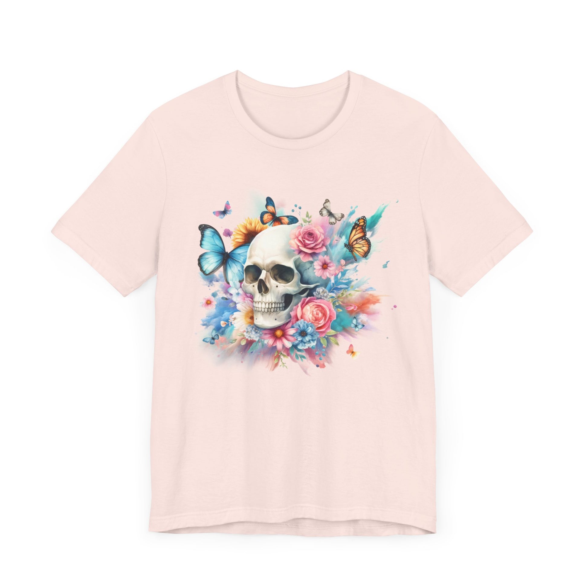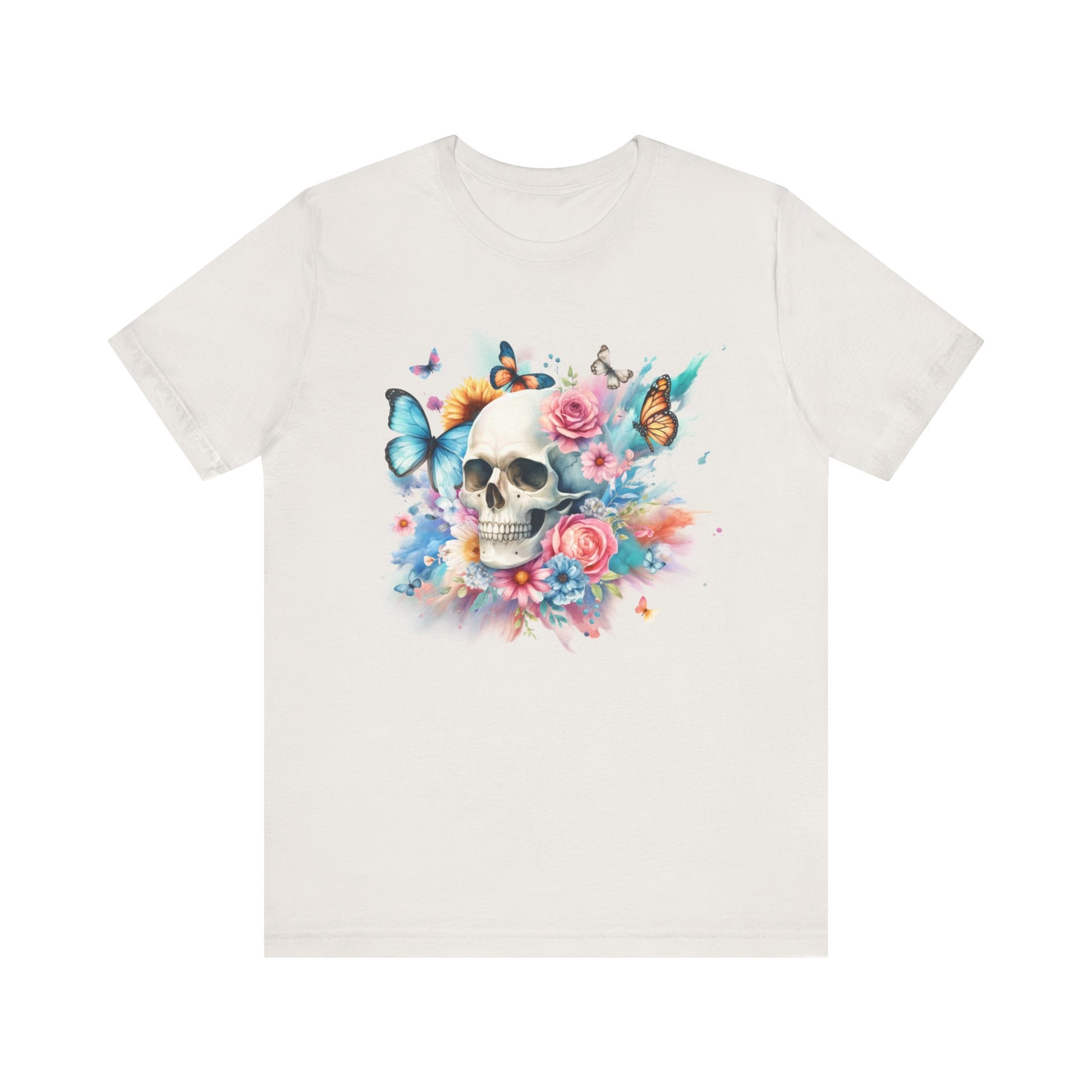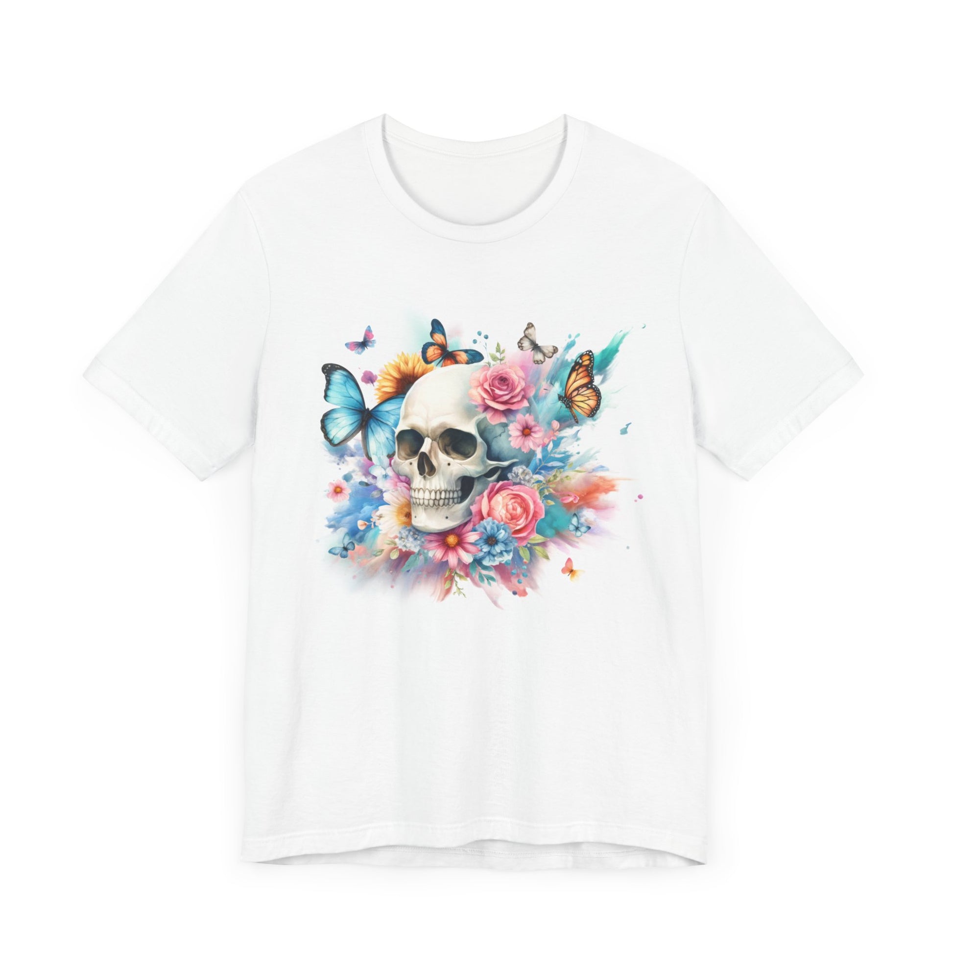 Add a pop of color to your wardrobe with this Watercolor Skull and Butterflies tee. This unisex jersey tee features a beautiful, vibrant design that will make you stand out from the crowd. Make a statement and embrace your unique style with this colorful tee!