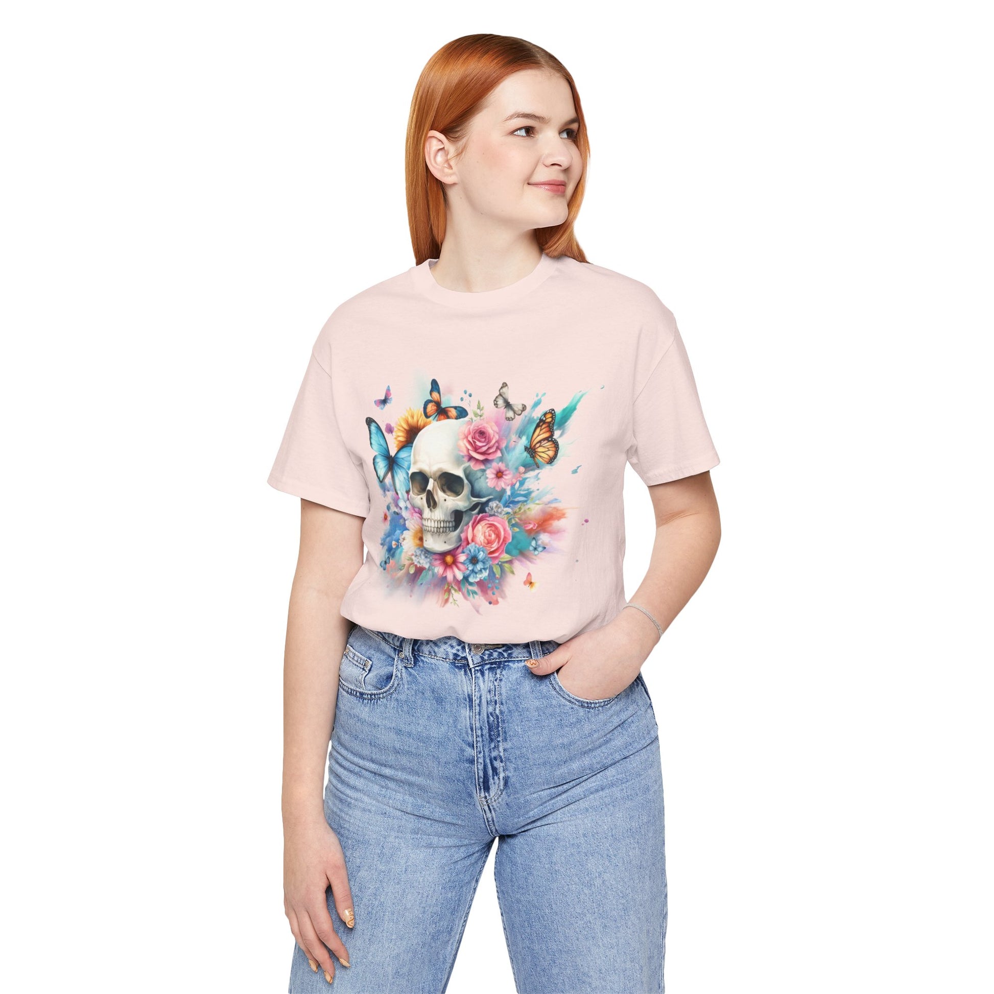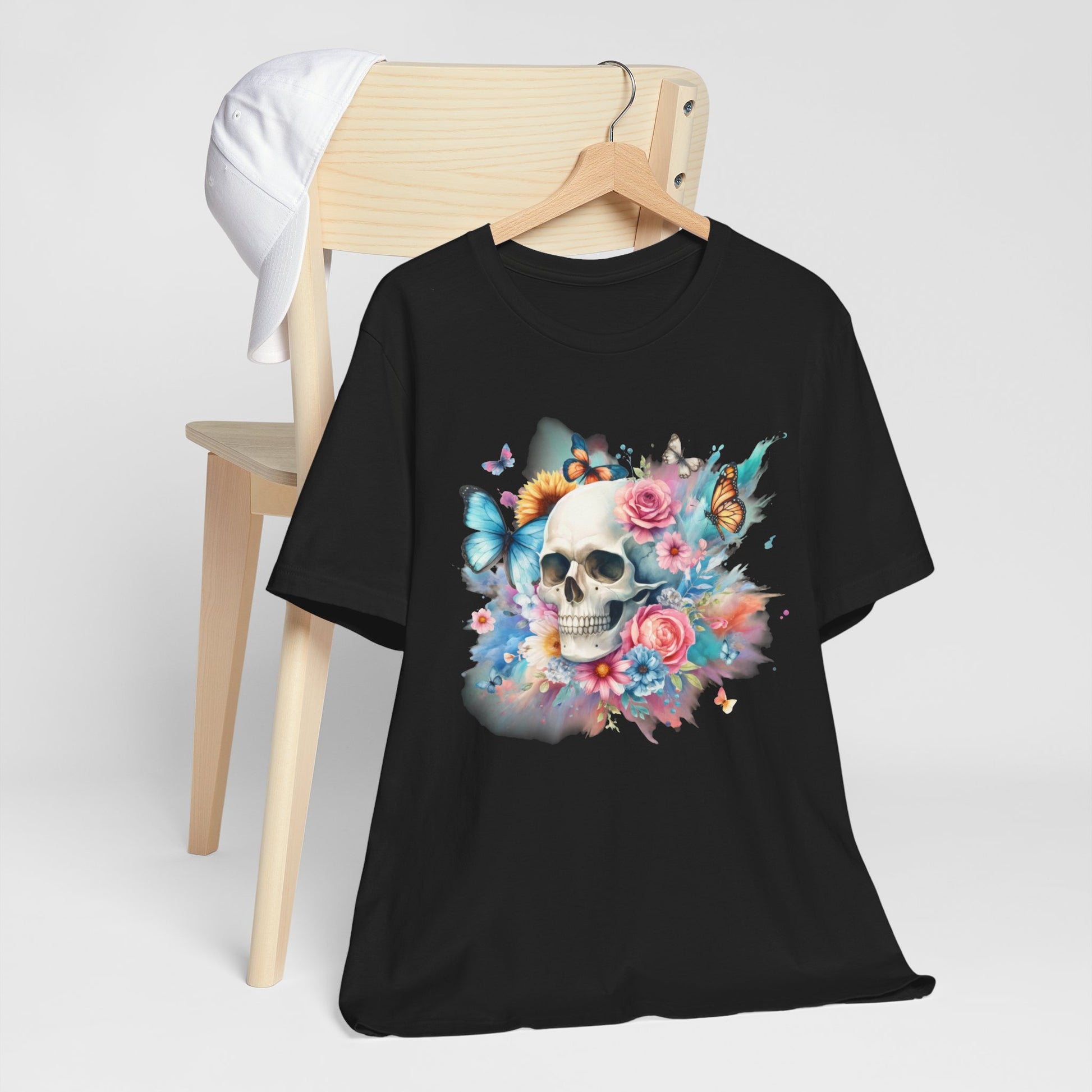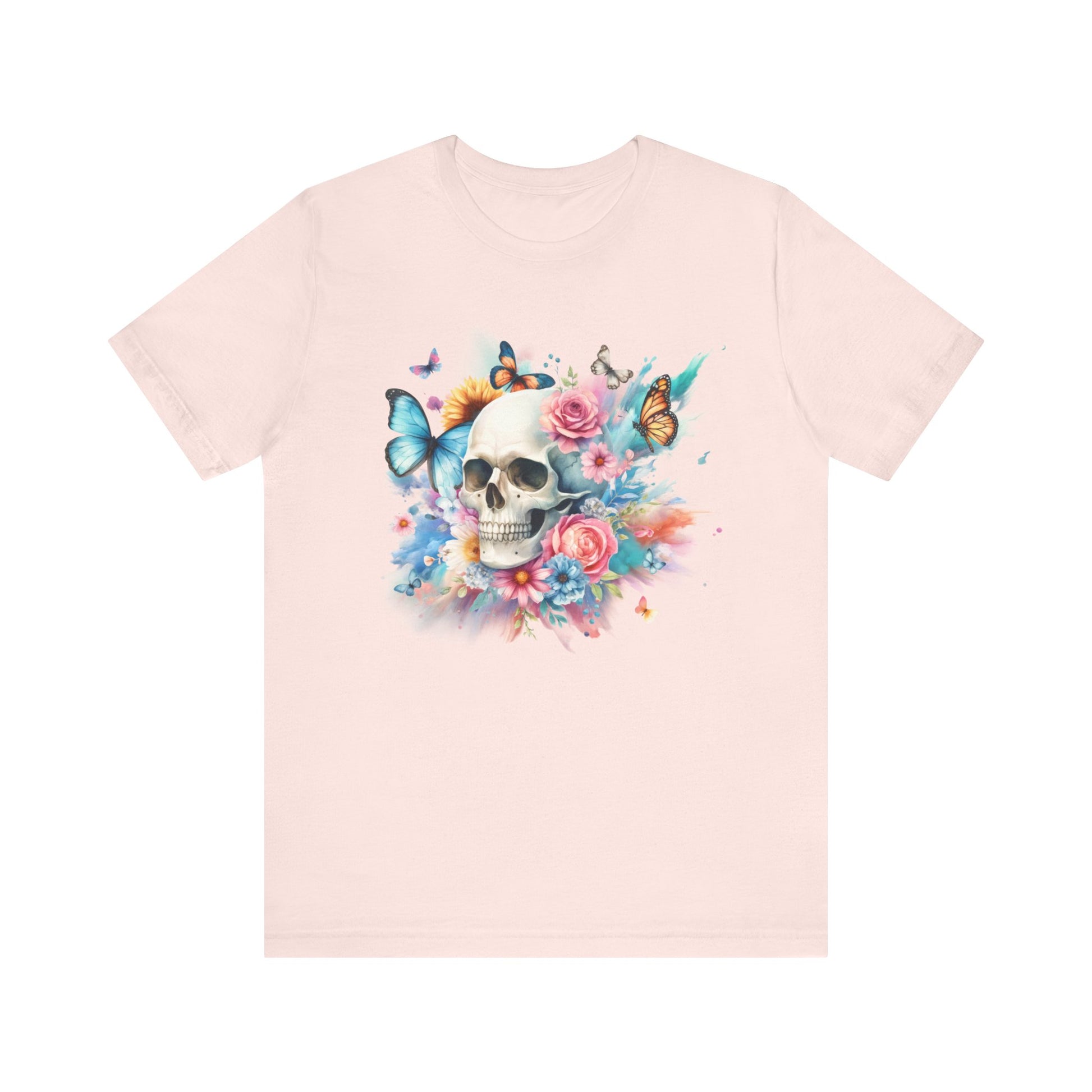 Add a pop of color to your wardrobe with this Watercolor Skull and Butterflies tee. This unisex jersey tee features a beautiful, vibrant design that will make you stand out from the crowd. Make a statement and embrace your unique style with this colorful tee!